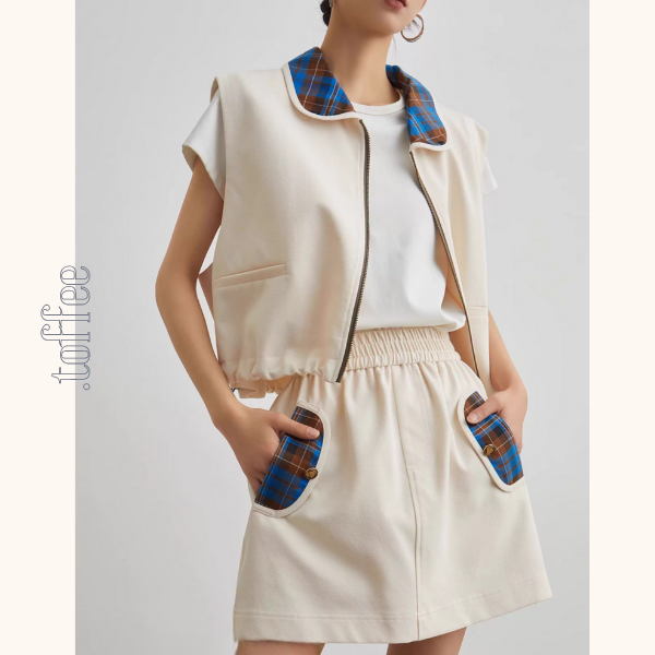 フロントジップアップベストとミニスカートのセットアップ。チェック柄のアクセントが、上品さとカジュアルさを兼ね備えた、おしゃれな上下セットです。ベストはすっきりとしたシルエットで、ミニスカートとのバランスが絶妙。普段使いはもちろん、デートやちょっとしたお出かけにもおすすめです。