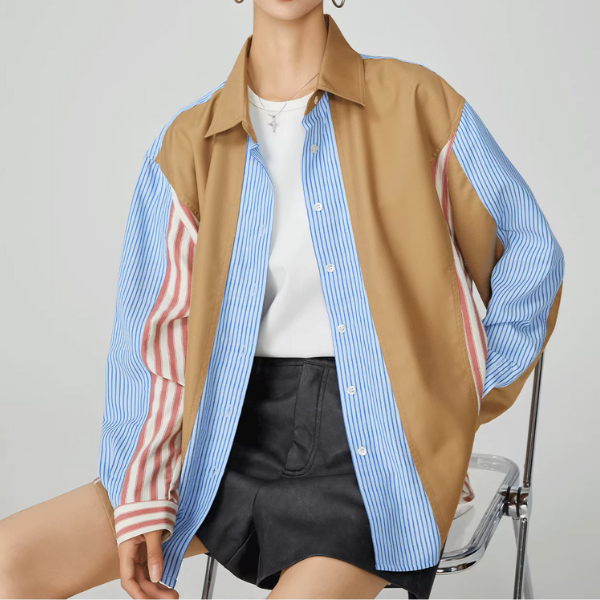 パッチワークストライプオーバーサイズロングスリーブシャツ《Z00951》
