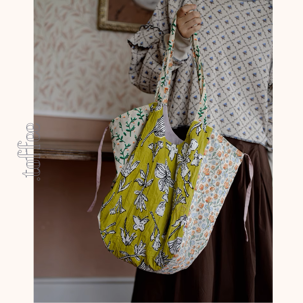 パッチワーク風のデザインが魅力的なトートバッグです。