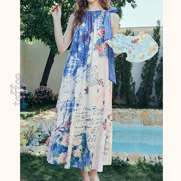 ブルーベースの美しい色合いに、美しく咲く花々がプリントされたホルターネックワンピース。一枚で存在感を放ち、リラックスした着こなしを叶えると同時に、ビーチやパーティーなどさまざまなシーンでの着用に最適です。ショルダー部分の大きなリボンも愛らしくてポイントです♡