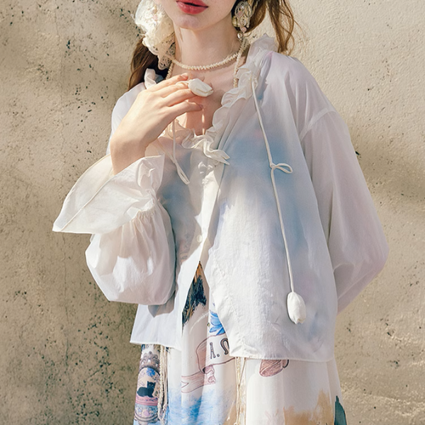柔らかなオフホワイトカラーのフリルシアークロップドカーディガン。可愛らしいドローストリングがアクセントとなり、さっと羽織るだけで華やかなコーディネートに変身します。デニムと合わせてカジュアルに、またはワンピースに羽織って女性らしさを演出しても◎