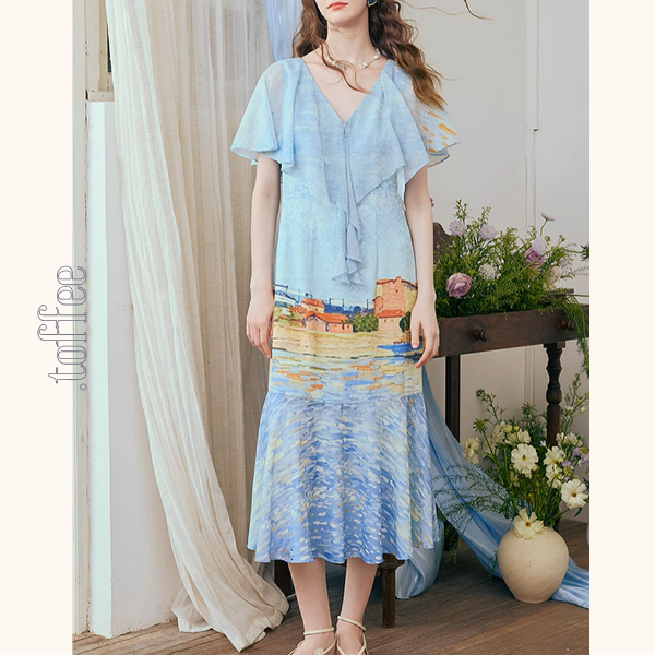 「海が見える家」をテーマにしたシフォンプリントロングワンピース。美しい海景色をイメージしたデザインで、波の音が耳に心地よく響いてきそう♡夏のお出かけやビーチサイドでのリゾートスタイルにぴったりの一着です。