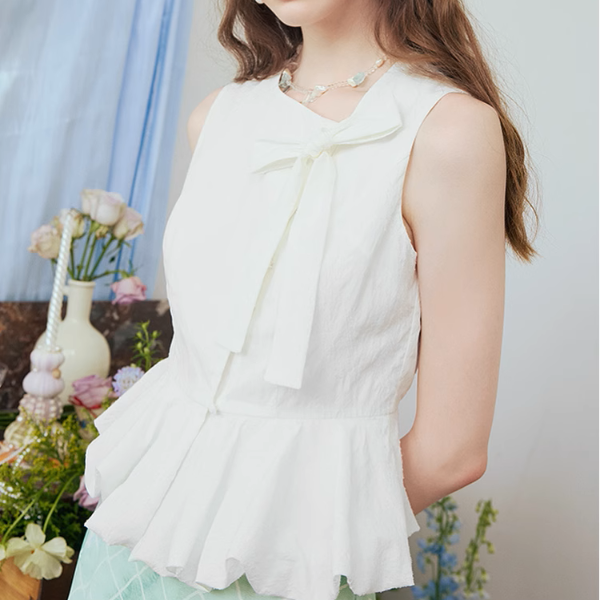 清楚なホワイトのノースリーブ仕様が魅力の、アシンメトリーペプラムトップ。リボンの装飾が施され、可愛さUP♡合わせの部分が斜めになっているデザインもポイントです。