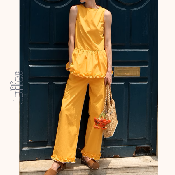 上品なターメリックカラーが魅力の、レースヘムペプラムノースリーブトップ&ストレートパンツセットアップ。女性らしさを引き立てるペプラムデザインが、シルエットを美しく見せてくれます。リラックスした印象ながらも、エレガントさを兼ね備えており、カジュアルなランチや特別な日のお出かけにもぴったりです♡