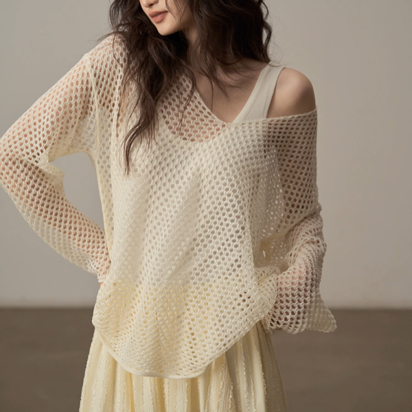 涼しげなメッシュ素材で仕立てられた、オーバーサイズニットトップ。ゆったりとしたシルエットはリラックスした着心地を実現。キャミソールやタンクトップとの重ね着にも最適なアイテムです。デニムやリネンパンツと合わせて、涼しい季節のおしゃれを楽しんでくださいね♡