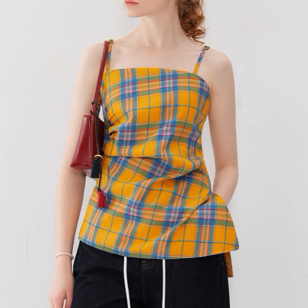 タータンチェックが印象的なアシンメトリーヘムキャミソール。左右で異なる裾丈が、動きのあるスタイリングを楽しませてくれます。カジュアルなデニムやスカートと合わせることで、日常のコーディネートをワンランクアップさせます。おしゃれなディテールが魅力のアイテム。