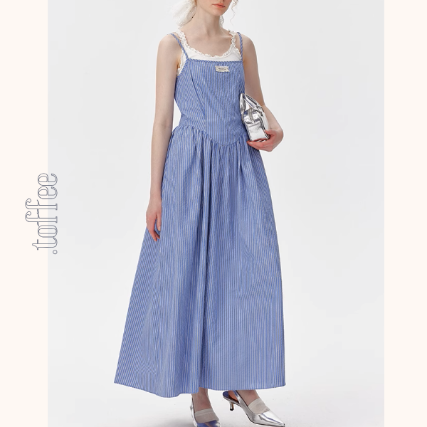 洗練されたデザインのブルーストライプロングキャミワンピース。涼やかなブルーストライプの生地が、明るい印象を与えつつ、身に着けるだけで大人の魅力を引き出してくれます。