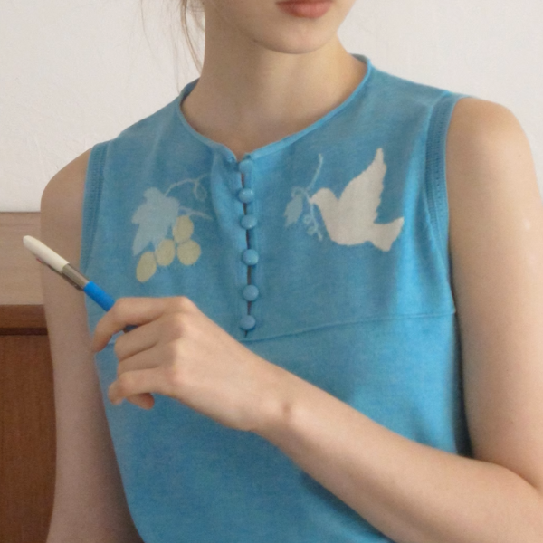 羽ばたく鳥と木の実の美しいデザインが特徴的な、シアーニットベスト。涼し気なブルーが、夏のコーディネートにぴったりマッチし、軽やかさと華やかさをプラスします。暖かい季節のお出かけやカジュアルな日常使いに最適なアイテムです。