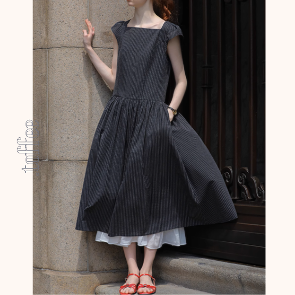 スタイリッシュな印象を与える、スクエアカラーストライプワンピース。ブラックのベースにストライプ模様が施されており、シンプルながらも洗練されたデザインが魅力です。上品なシルエットですので、特別なお出かけにも最適です。