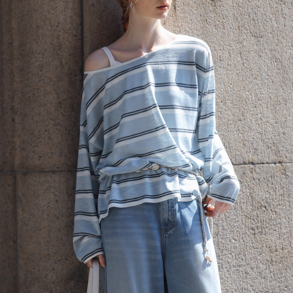 個性的なワンショルダーのデザインが目を引く、ストライプシアーニットトップ。爽やかなブルーのカラーが、夏のおしゃれを演出します。デニムやスカートとコーディネートして、自分らしいスタイルを楽しんでくださいね♡