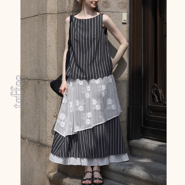 ストライプノースリーブトップ&レース装飾ロングスカートセットアップ《Z01028》