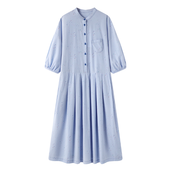 まるで水彩絵の具が跳ねたようなカラフルなドット模様が、控えめながらも心くすぐるデザイン。胸元の丸いポケットやブルーのボタンなど、細部にもレトロな遊び心を忍ばせました。ベーシックでありながら、少しだけ“自分らしさ”を加えたい女性にぴったりな一着です。ナチュラルで軽やかな印象を纏って、お出かけや日常に彩りを♡