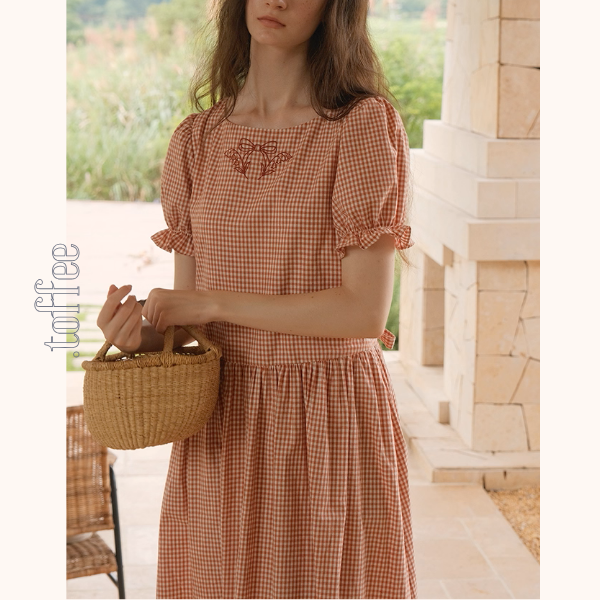 リボン刺繍のギンガムチェックワンピース《Z01054》