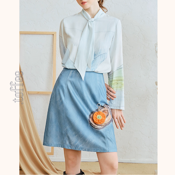 印象的なバックスタイルが魅力のショートスカート。後ろには幻想的なアート風プリントが施され、歩くたびに視線を集めます。フロントには不思議な“切り株の絵”と、オレンジの編みチャーム付き。ベーシックな台形シルエットだから着回しやすく、ブラウスやニットとも相性抜群。シンプルな日常に、ちょっぴり個性とレトロな可愛さを添えてくれるアイテムです。