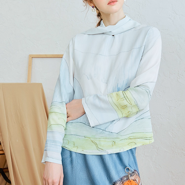 まるで一枚の風景画を身に纏うような、アートタッチのプリントが印象的なデザインシャツ。