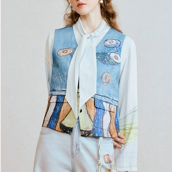 幻想的な風景画のようなアートプリントが目を惹く、Vネックベスト。まるでキャンバスに描かれた物語の一場面を纏うような感覚に。さらりと羽織るだけで、シンプルなコーディネートに奥行きと個性をプラスしてくれます。カットソーやブラウスとのレイヤードにもぴったりで、デニムにもスカートにも合わせやすく、大人カジュアルにこなれ感を演出。ベーシックの中に“ひとさじのアート”を添える一枚です。