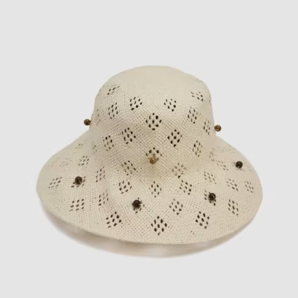ナチュラルな風合いのストロー素材に、透かし編み模様とブラウンビーズを散りばめた、大人の遊び心あふれるストローハット。通気性の良い軽やかなデザインで、春夏のお出かけや旅行にもぴったり。ほどよいツバ広シルエットが顔まわりにやさしい影をつくり、紫外線対策もおしゃれにこなせます。ベーシックスタイルにさりげないアクセントを加えたい大人の女性におすすめの一点。レトロ可愛い装いにも自然に溶け込み、どこか懐かしさと新しさを感じさせるアイテムです。
