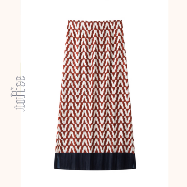 大胆なVライン模様と、裾に施されたブラックの切替が目を惹くプリーツスカート。遊び心のある柄ながら、落ち着いた色味と上品なプリーツが大人の可愛らしさを演出します。しなやかな素材で歩くたびにふんわり揺れ、洗練された女性らしさを引き立てます。ベーシックにちょっとだけ個性を添えたい──そんな気分にぴったりの一枚。
