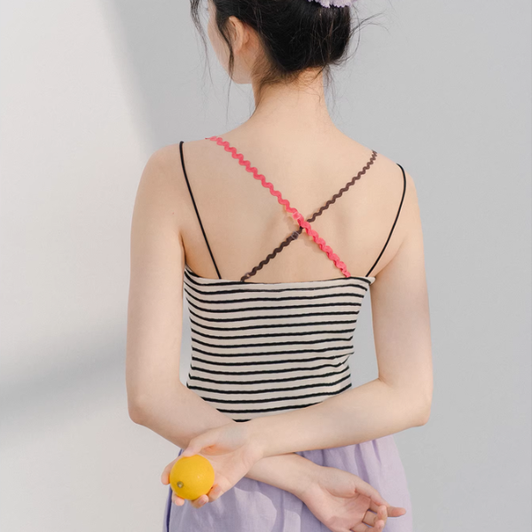 背中のストラップがクロスになった、360度どこから見ても抜け感のあるキャミソールです。細めのボーダーが大人のカジュアルを引き締め、夏の日差しに映えるカラーリングも魅力。ハイウエストボトムやフレアスカートと合わせて、軽やかなスタイルをお楽しみください。