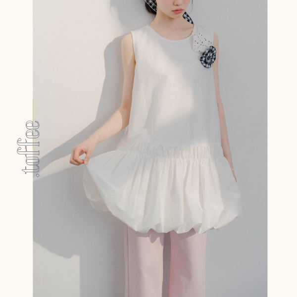 ノースリーブのすっきりしたデザインが涼やかで、チェック柄×無地の異素材フラワーがさりげなく視線を惹きつけます。