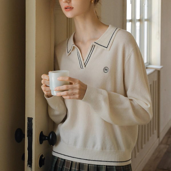【2color】レトロ配色ポロカラーニットプルオーバー《Z01115》