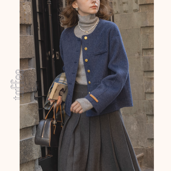 クルーネックのすっきりとした首元と、金のコインのようなボタンが印象的なショートコートです。フロントに並ぶ輝きが、ほんのささりげない華やぎを与え、日常のスタイルを上品に格上げ。サイドポケット付きで実用性もありながら、クラシックでモダンな雰囲気を楽しめます。シンプルな中に個性を感じ、大人のためのアートコート。いつものコーデに「自分らしい残り韻」を添えて一着です。