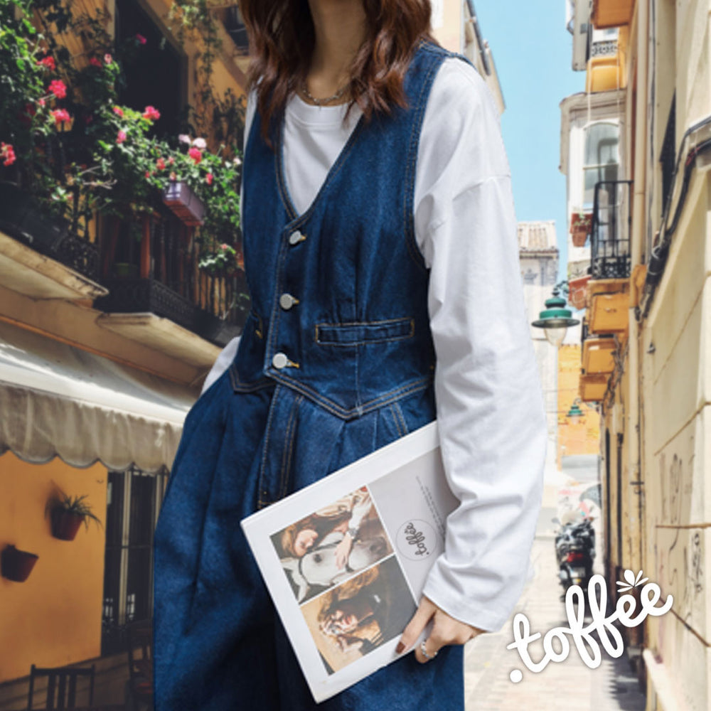 スッキリとしたベストのようなトップとボリューミーなボトムスをデニム素材でカジュアルにまとめたオールインワン。