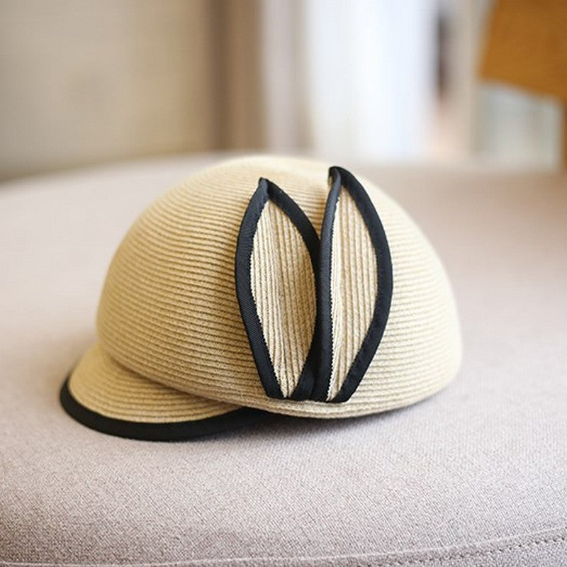丸いフォルムにウサギの耳のような、葉っぱのようなワンポイントがついた麦わらキャスケット