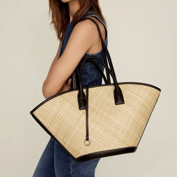 扇型のシルエットと黒のパイピングがスタイリッシュで大人の上質なカゴバッグです