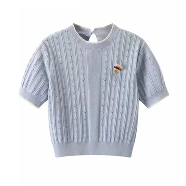 胸元にさりげないサイズ感のアイスクリームがあしらわれたかわいらしいトップス。