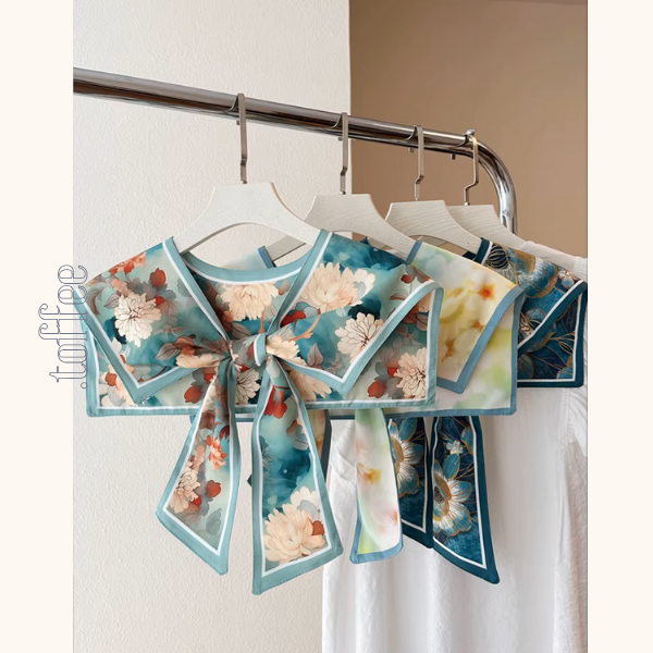 重ね着スタイルにそっとアートな空気を添える、ショール風デザインのつけ襟。フロントでキュっとリボンのように結ばれた仕様で、元は体感と可愛らしさをプラスします。全6パターン展開で、花・鳥・葉・太陽など多彩なモチーフをくすみカラーの縁取りと共に描いた、物語のような世界観が魅力。