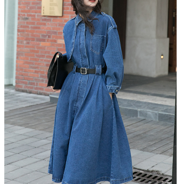 片側にあしらわれた存在感抜群のフラップが動きを与えるデニムワンピース。