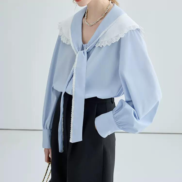 フリルカラーとボウタイの組み合わせがフェミニンな愛らしいシャツです。