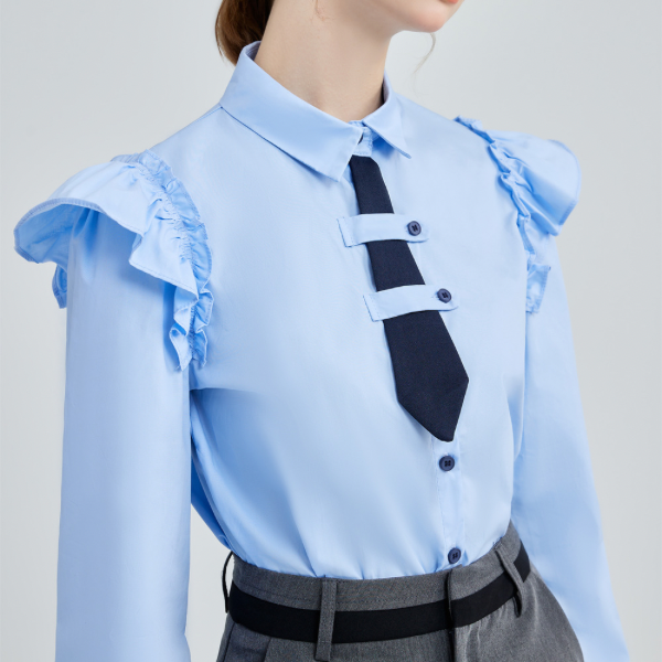 デニムやチノパンなどカジュアルなパンツと合わせれば、甘すぎない大人な着こなしに。