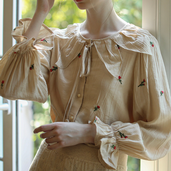 お花の刺しゅうがふわっとかわいくあしらわれたレトロブラウス。