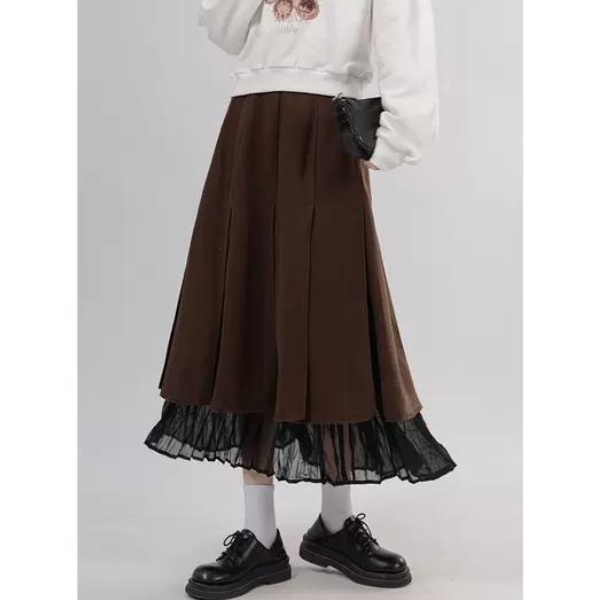 プリーツのトラッド感は残しつつ、裾の透け感で重たくなりすぎず着用できます。
