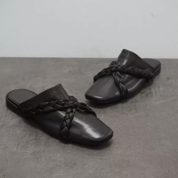 ブラックレザーに編み込んだクロスバンドがシックなフラットミュール。
