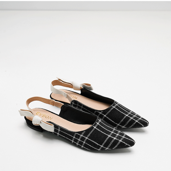 モノトーンの色合わせとポインテッドトゥが甘さをおさえて、大人も使いやすいフラットシューズ。