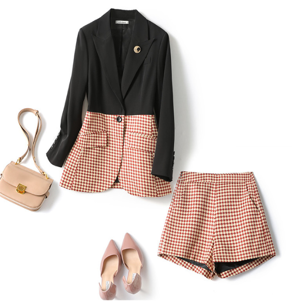 千鳥格子でウエストから切り替えてあるデザイン性の高いジャケットと、同柄のショートパンツのセットアップ。