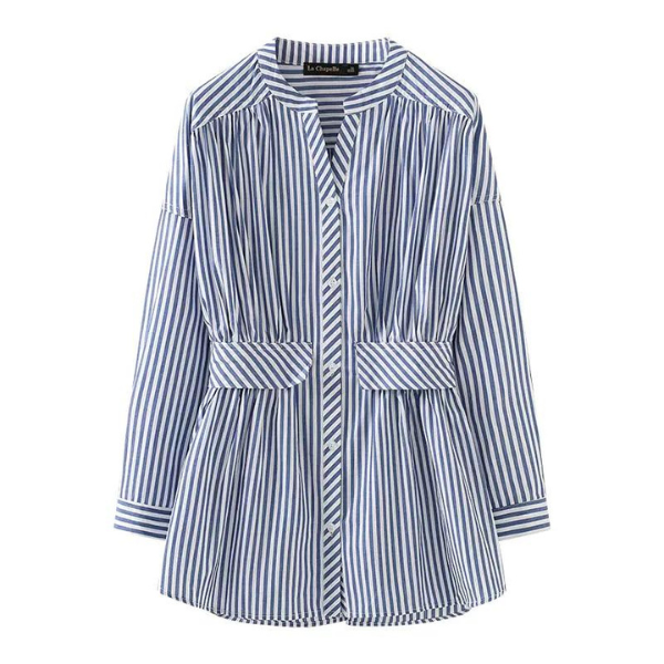ウエストがシェイプされたぺプラム風デザインのストライプシャツ。