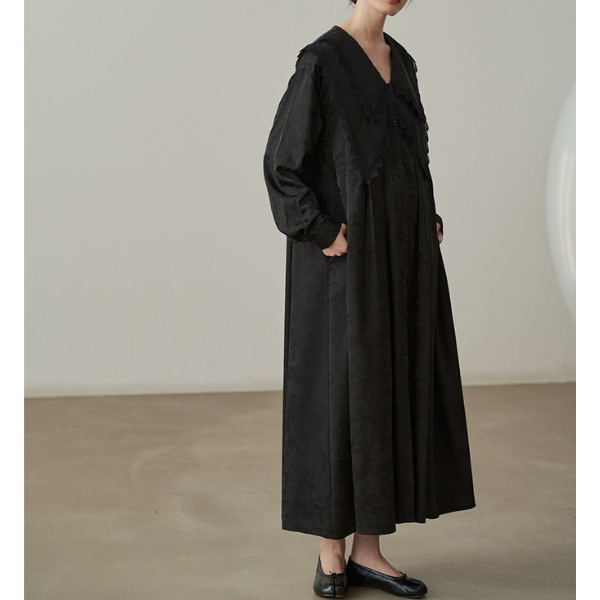 二重のビッグカラーとツヤ感のあるジャガード生地がエレガントなワンピース。