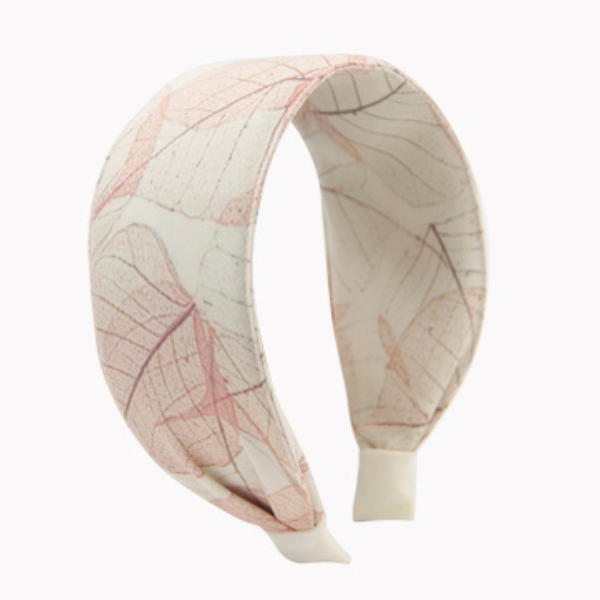 ピンク色のスケルトンリーフがプリントされたアートのようなカチューシャ。