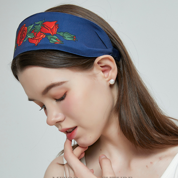 インディゴブルーに真っ赤なローズプリントが映えるヴィンテージ風の幅広カチューシャ。