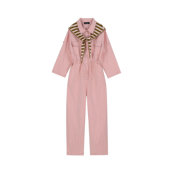 ハンサムなジャンプスーツを甘いピンクでバランス良く仕上げた一着。