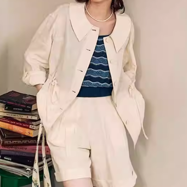 広く開いたフラットカラーのシャツジャケットがガーリーな印象のセットアップ。
