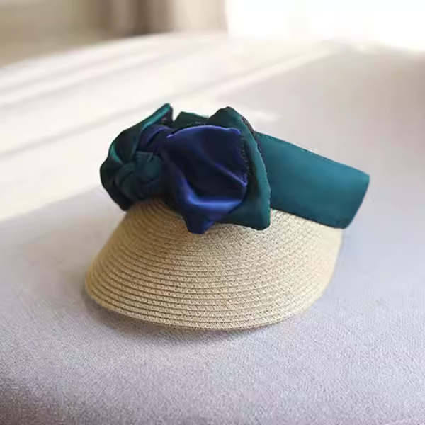 大きなサテン生地のリボンが華やかなサンバイザー。