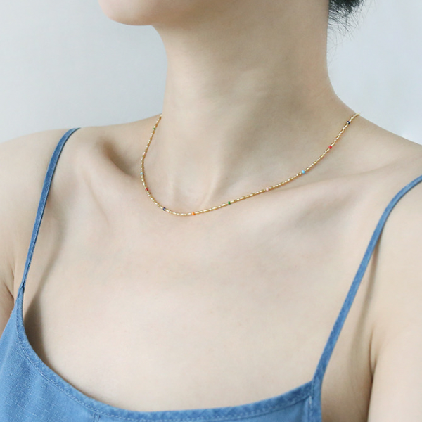 ところどころエナメル着色された鮮やかな色が、ゴールドに映えるシンプルネックレス。