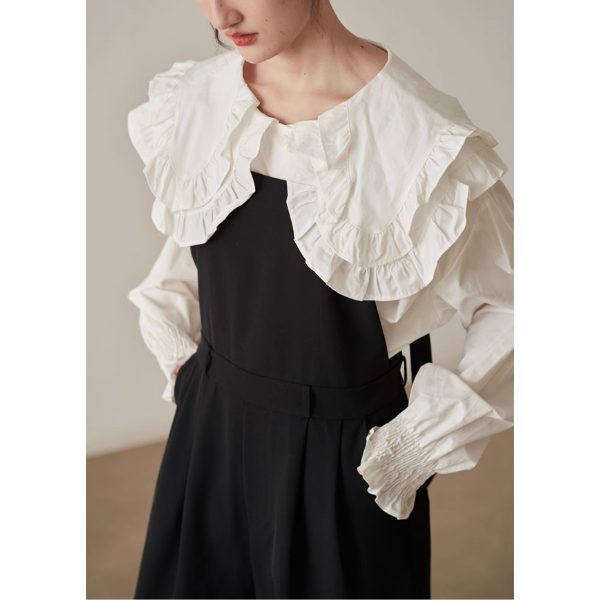 単体で着ても主役級のブラウスですが、ワンピースやオールインワン、ベストとの組み合わせで襟がコーディネートのアクセントになり、おしゃれな雰囲気を演出できます