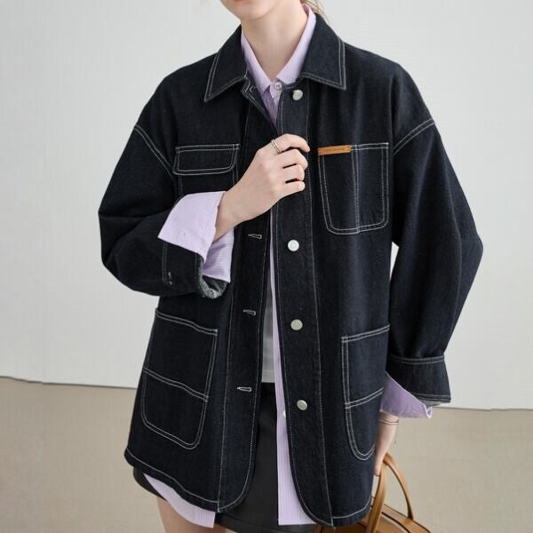 ホワイトのステッチが効いたデニム素材のワークジャケット。