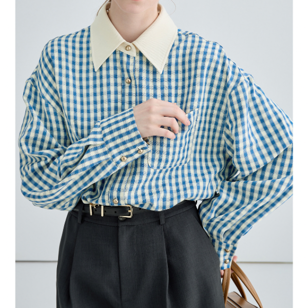 鮮やかなブルーのギンガムチェックがかわいいクレリックシャツ。